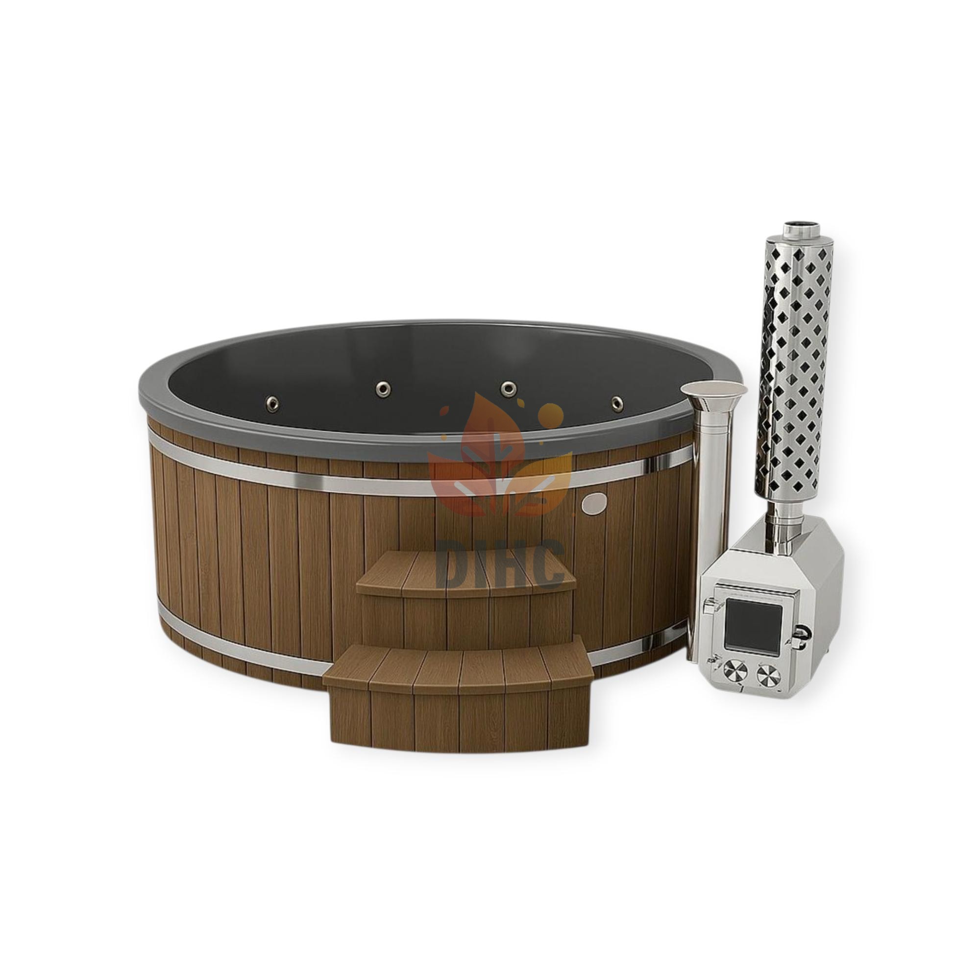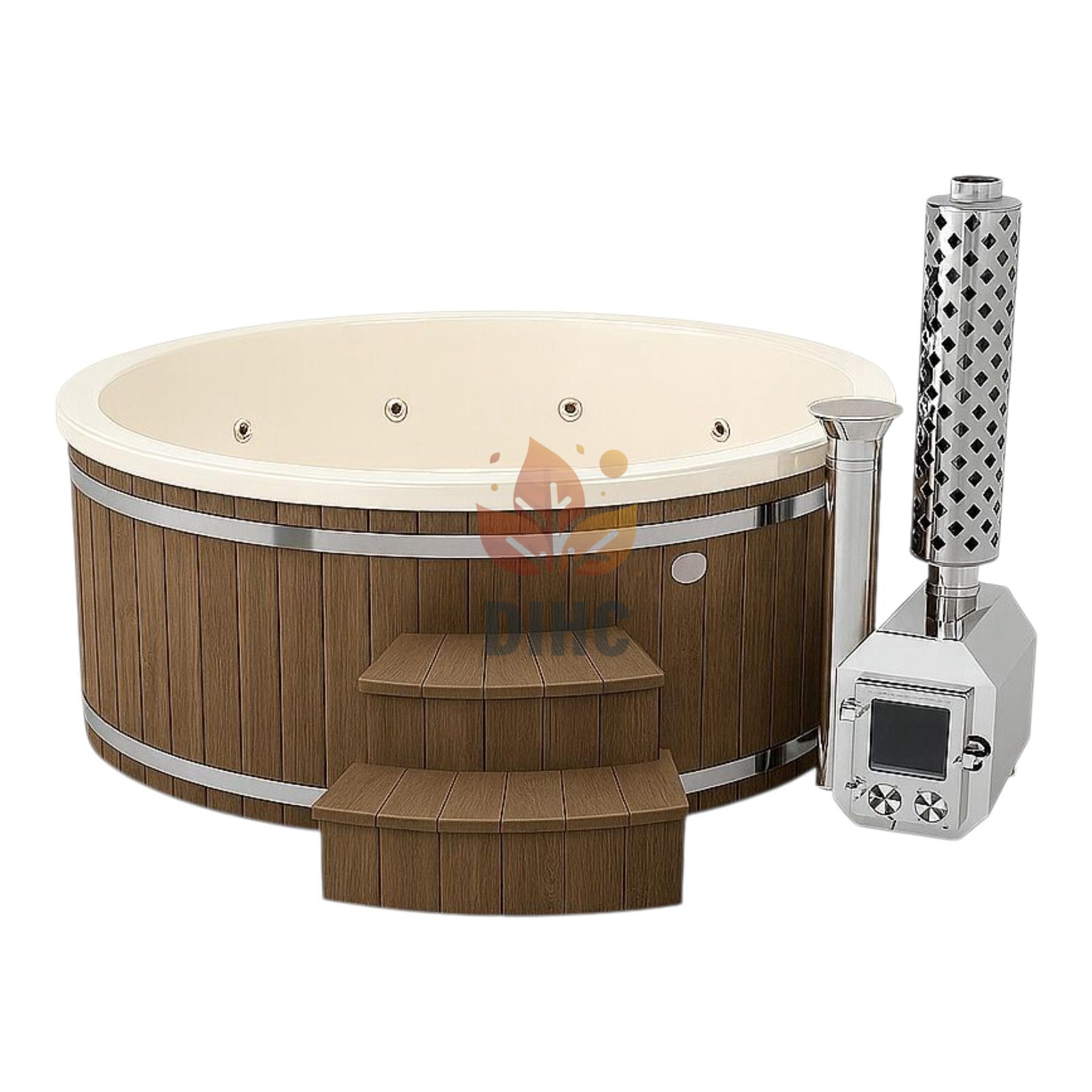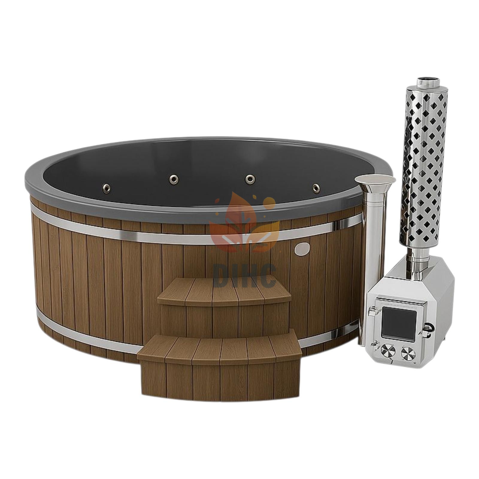 Opplev ekte komfort med vår luksus badestamp for 6–8 personer. Den elegante runde formen kombinert med en glassfiberinnsats av høy kvalitet gir både holdbarhet og moderne estetikk. De romslige dimensjonene – 2,0 m innvendig og 2,25 m utvendig diameter – sammen med en kraftig 8-kantet ekstern vedovn sørger for en behagelig spa-opplevelse utendørs.